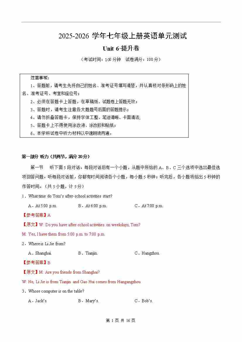 七年级英语上册 Unit 6 单元测试·提升卷(解析版)
