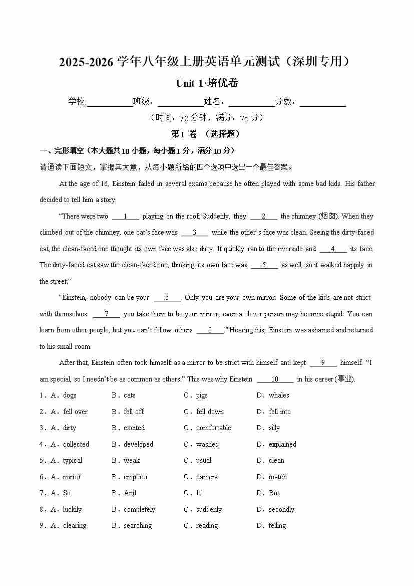首页 > 全部 > 单元地区卷 > 八年级英语上册Unit 1 单元测试·深圳专用(教师版)