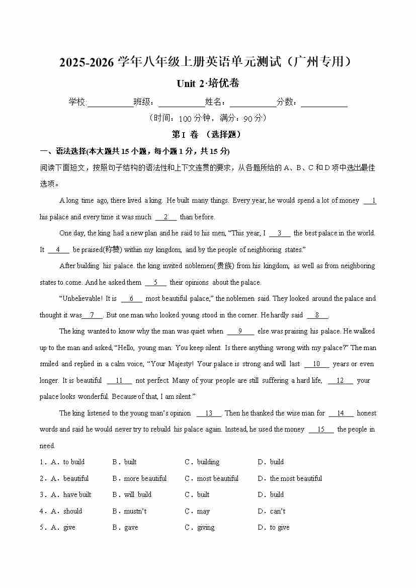八年级英语上册Unit 2 单元测试·广州专用(教师版)