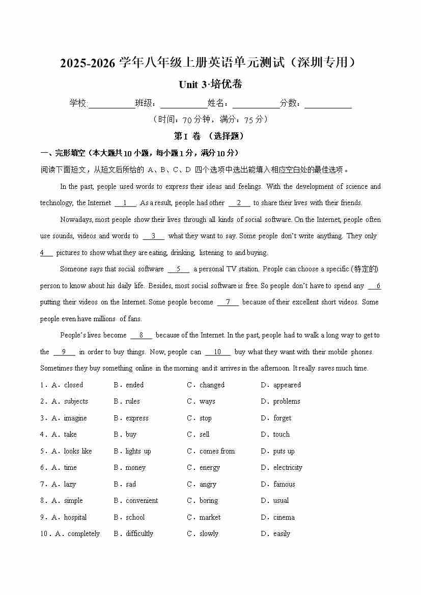 八年级英语上册Unit 3 单元测试·深圳专用(考试版A4)