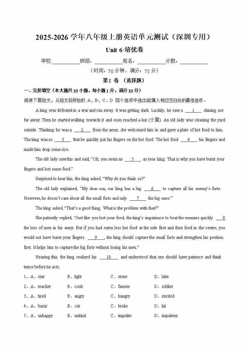 首页 > 全部 > 单元地区卷 > 八年级英语上册Unit 6 单元测试·深圳专用(考试版A4)