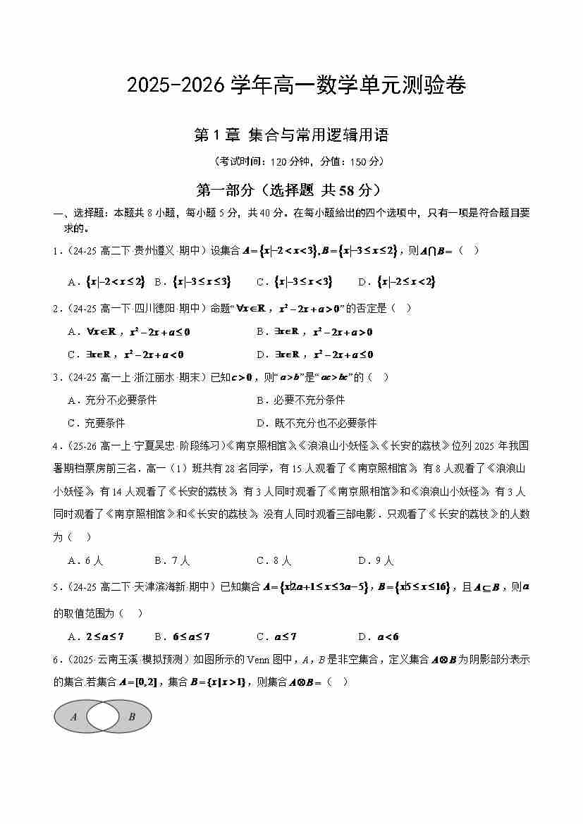 首页 > 全部 > 单元测试 > 第一章 集合与常用逻辑用语(单元测试·冲刺卷)(考试版A4)