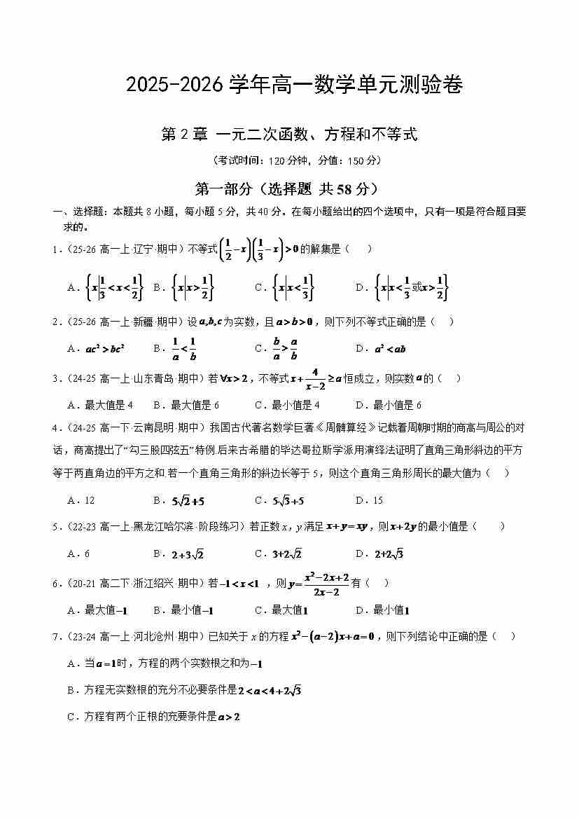 第二章 一元二次函数、方程和不等式(单元测试·冲刺卷)(考试版A4)