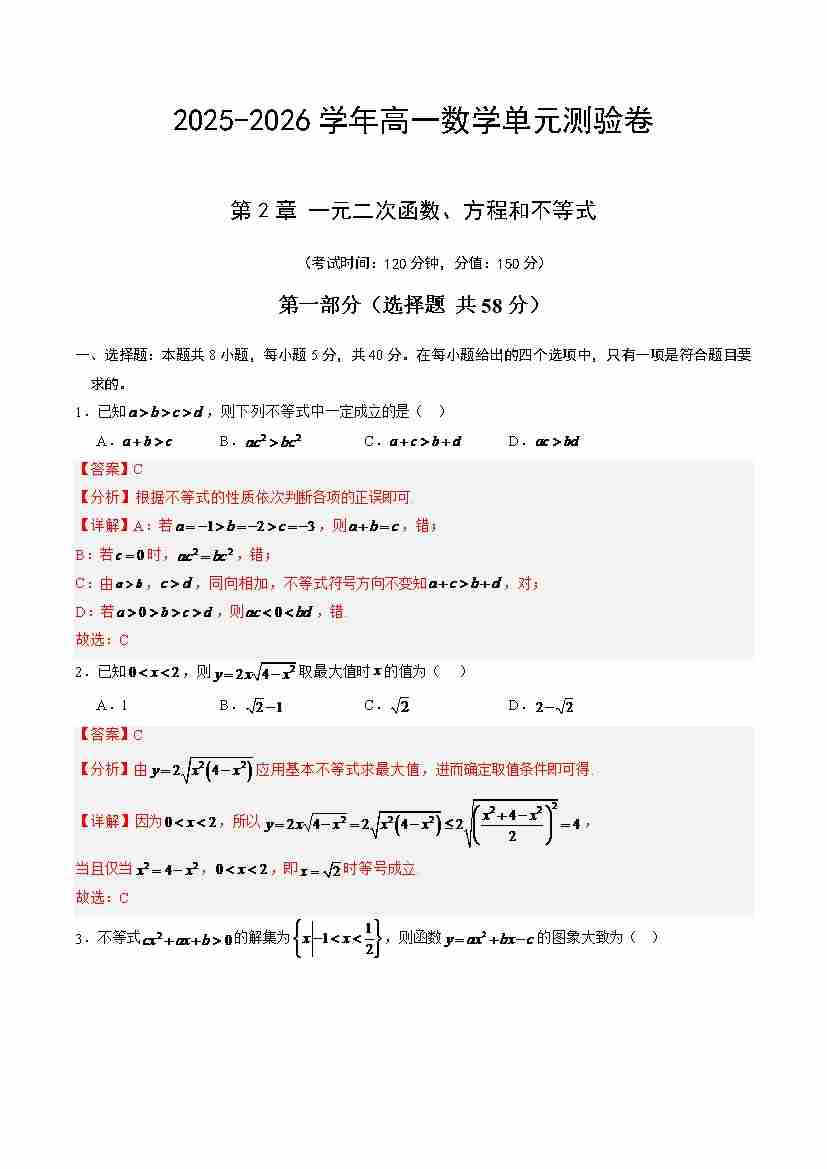 首页 > 全部 > 单元测试 > 第二章 一元二次函数、方程和不等式(单元测试·培优卷)(解析版)