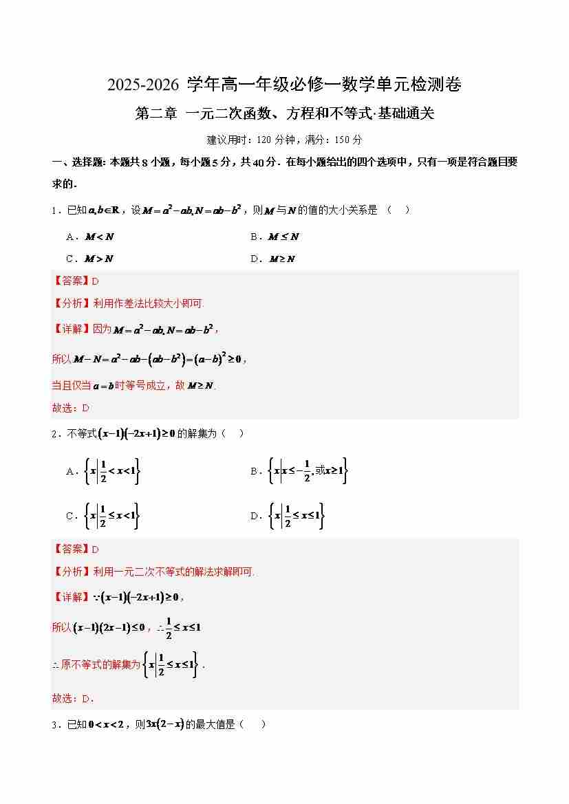 首页 > 全部 > 单元测试 > 高一必修一数学第二章测试:一元二次函数、方程和不等式·基础卷(教师版)