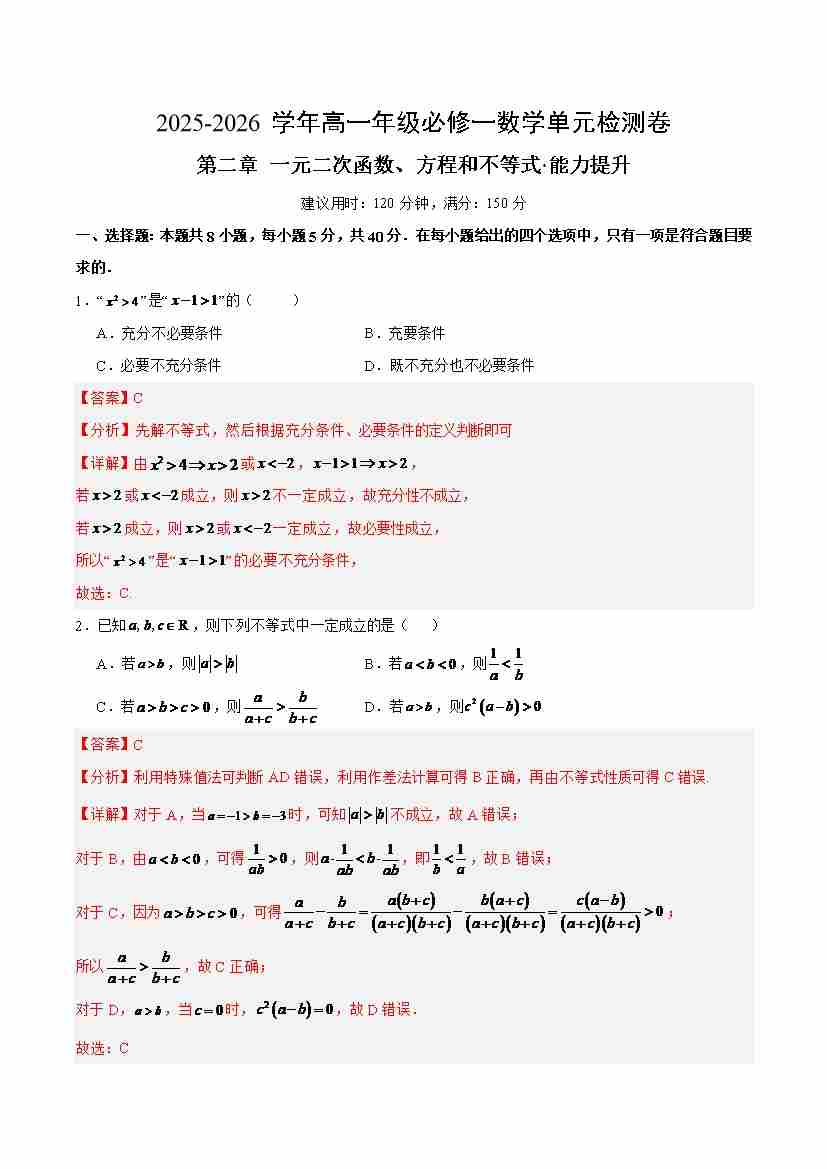 首页 > 全部 > 单元测试 > 高一必修一数学第二章测试:一元二次函数、方程和不等式·提升卷(教师版)