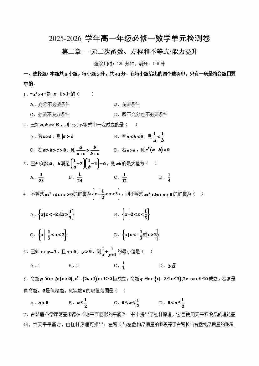 首页 > 全部 > 单元测试 > 高一必修一数学第二章测试:一元二次函数、方程和不等式·提升卷(考试版A4)