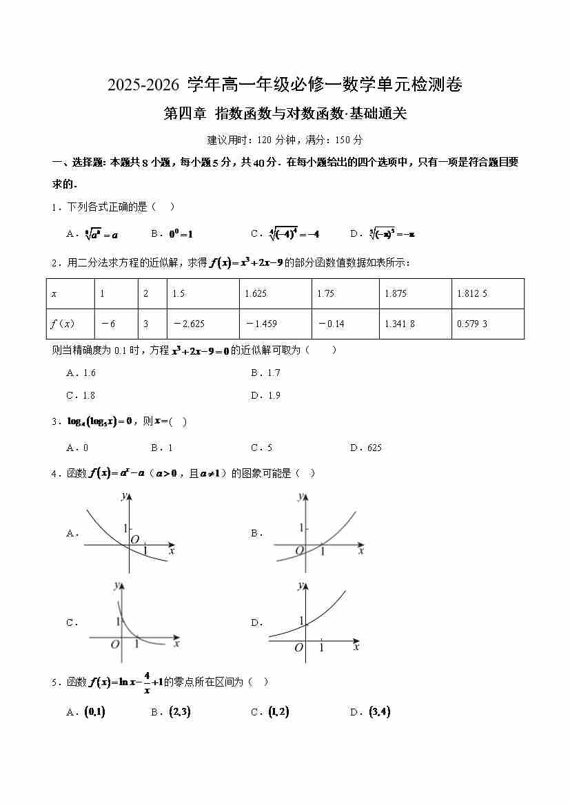 首页 > 全部 > 单元测试 > 高一必修一数学第四章测试:指数函数与对数函·基础卷(考试版A4)