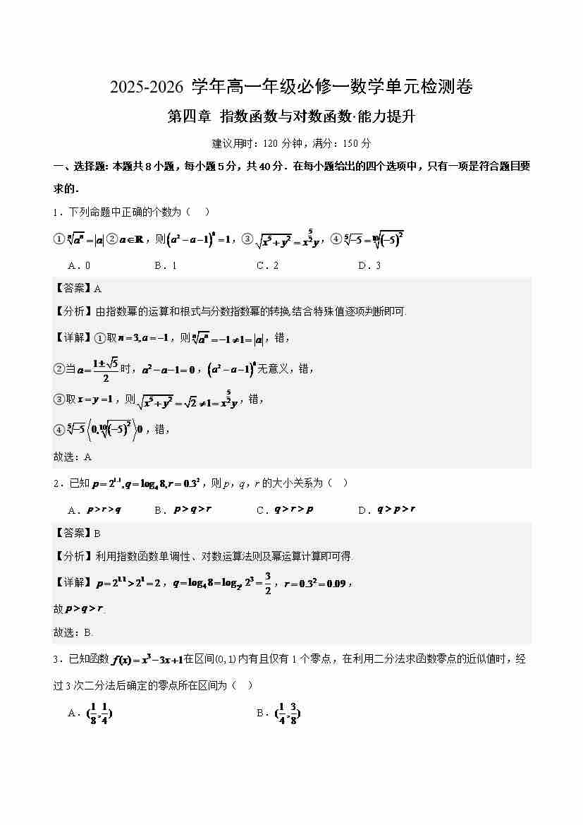 首页 > 全部 > 单元测试 > 高一必修一数学第四章测试:指数函数与对数函·提升卷(教师版)