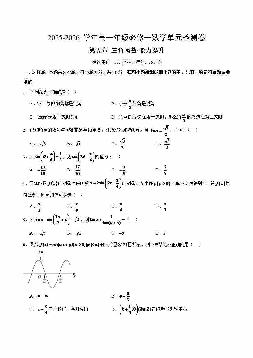 高一必修一数学第五章测试:三角函数·提升卷(考试版A4)