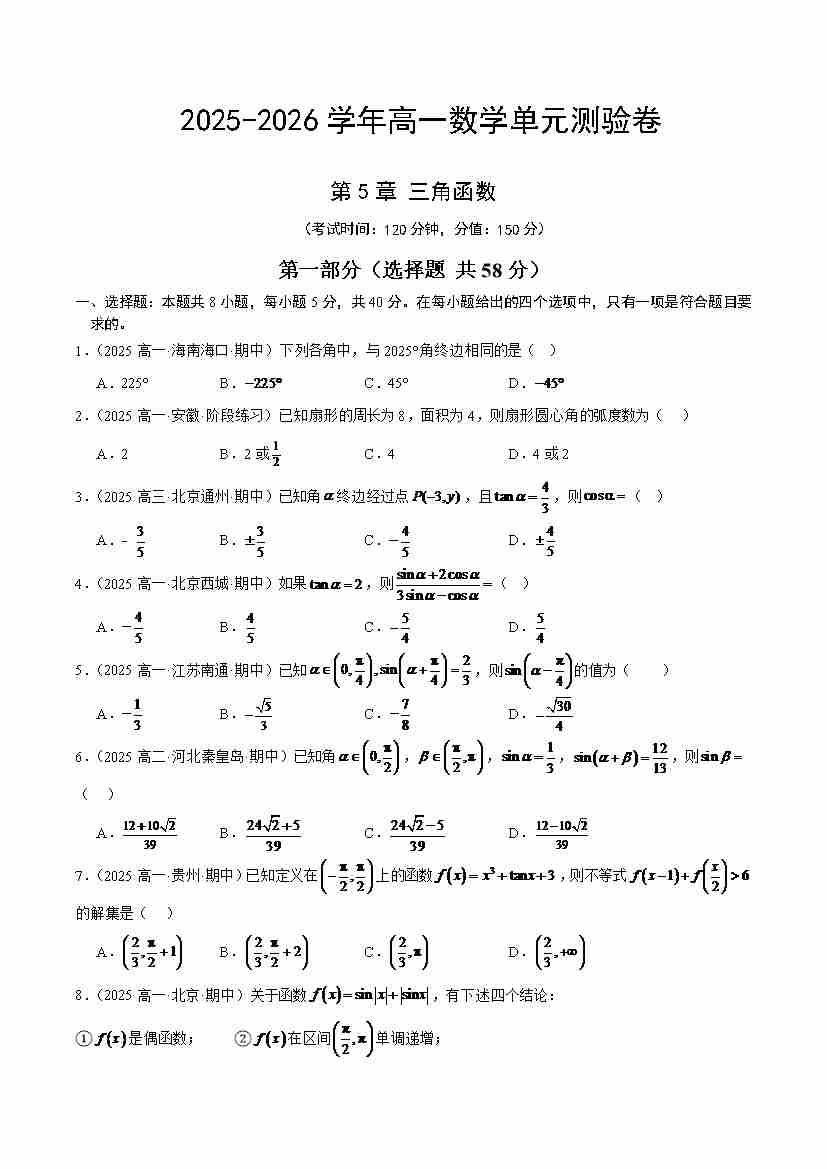 数学第五章 三角函数(单元测试·冲刺卷)(考试版A4)