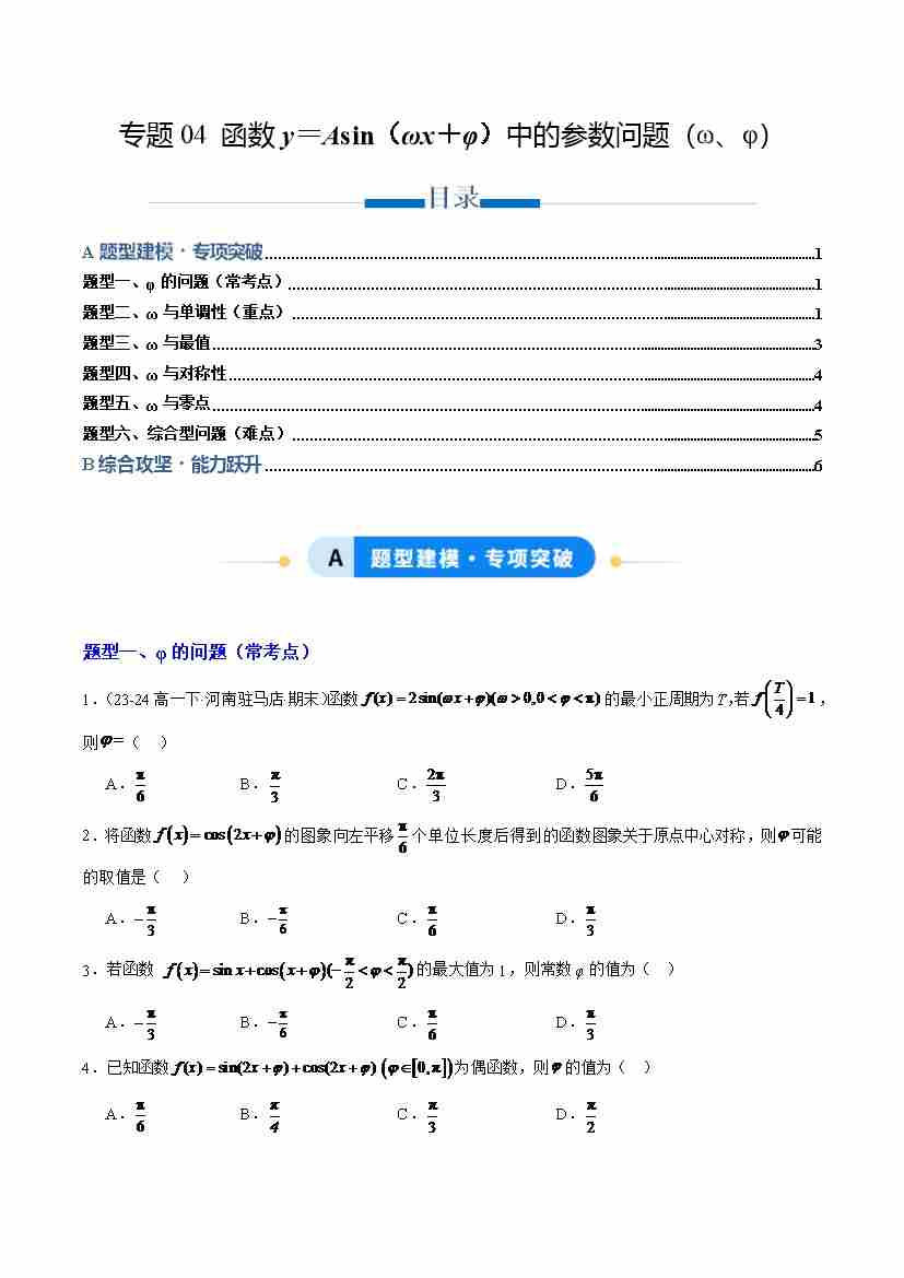 专题04 函数y=Asin(ωx+φ)中的参数问题(ω、φ)(专项训练6大重点题型)(原卷版)