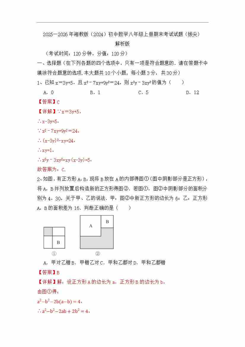 2025—2026年湘教版(2024)初中数学八年级上册期末试题(拔尖)解析版