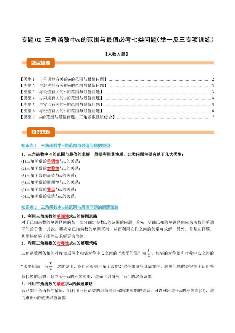 专题02 三角函数中ω的范围与最值必考七类问题(举一反三专项训练)(学生版)