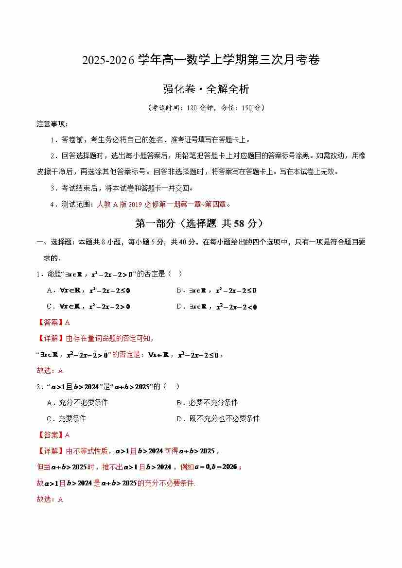 首页 > 全部 > 月考试卷 > 高一数学上学期第三次月考(高效培优·强化卷)(全解全析)