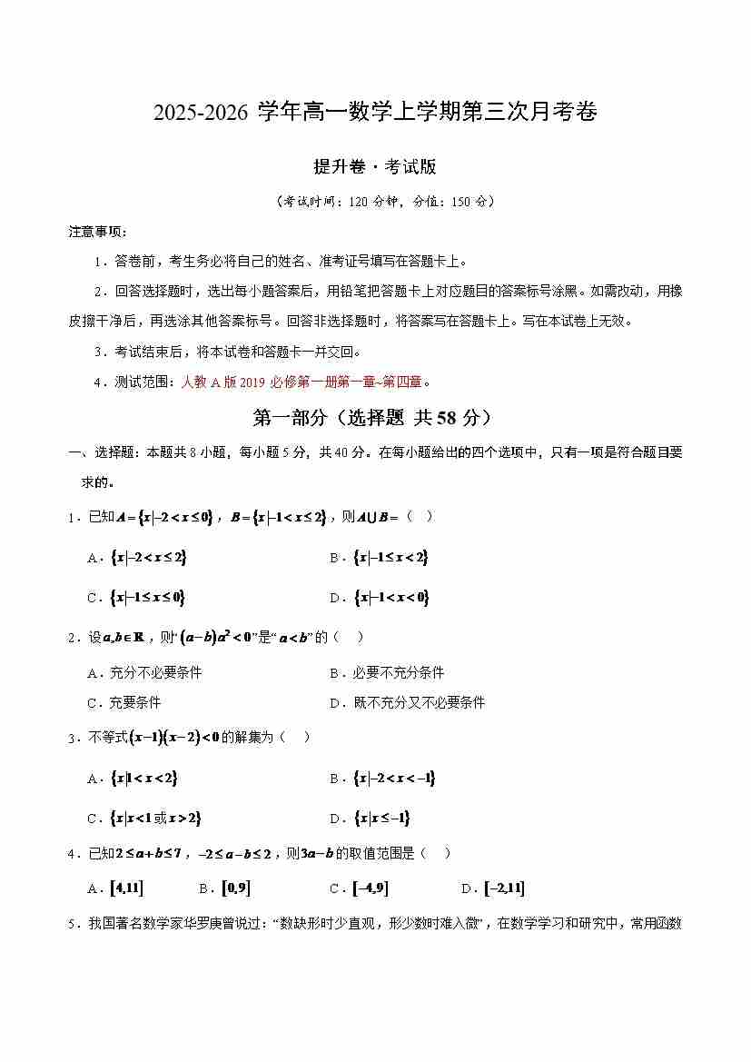 首页 > 全部 > 月考试卷 > 高一数学上学期第三次月考(高效培优·提升卷)(考试版A4)