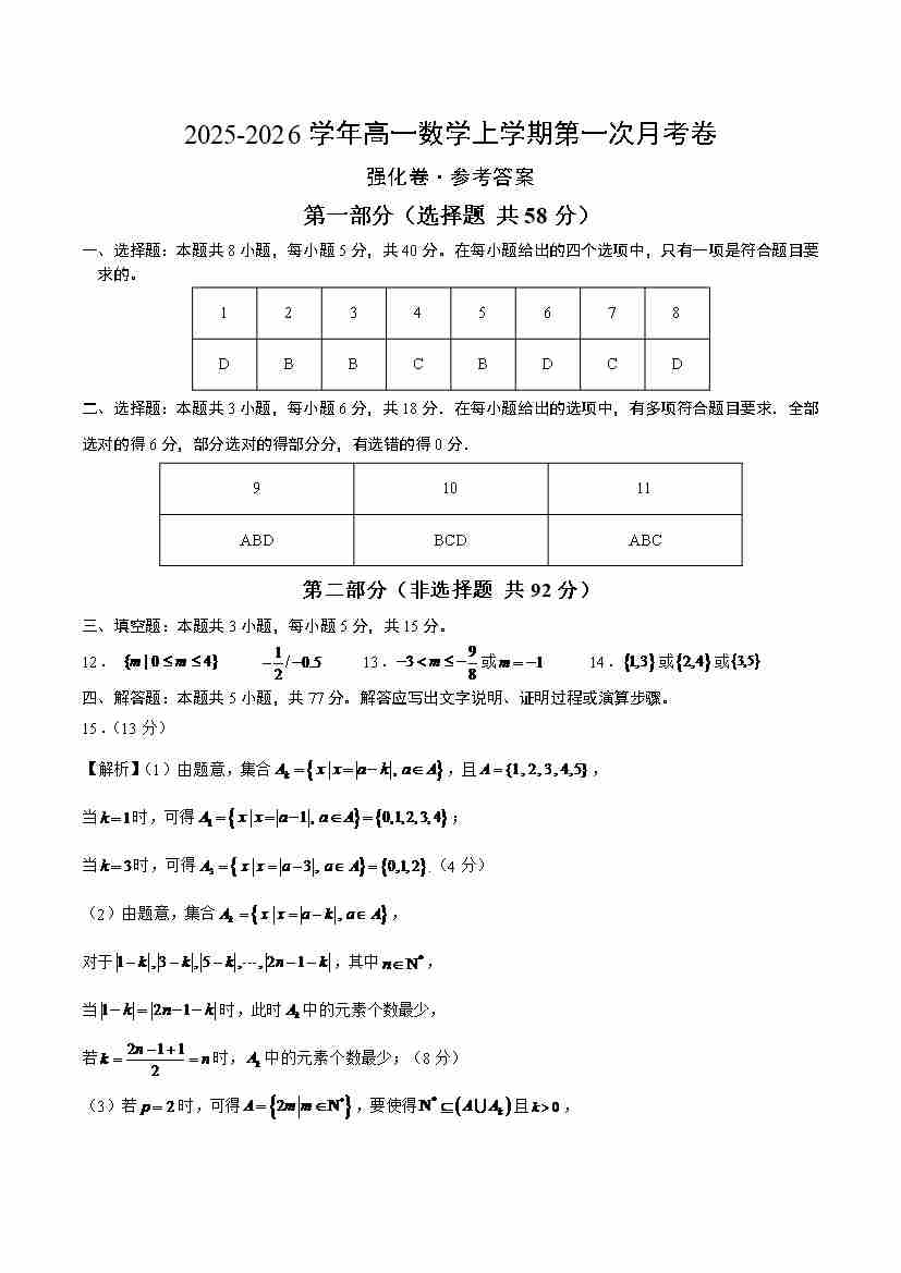 高一数学上学期第一次月考( 高效培优·强化卷)(参考答案)