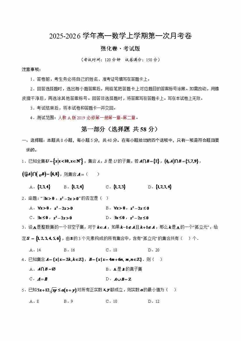 高一数学上学期第一次月考( 高效培优·强化卷)(考试版A4)