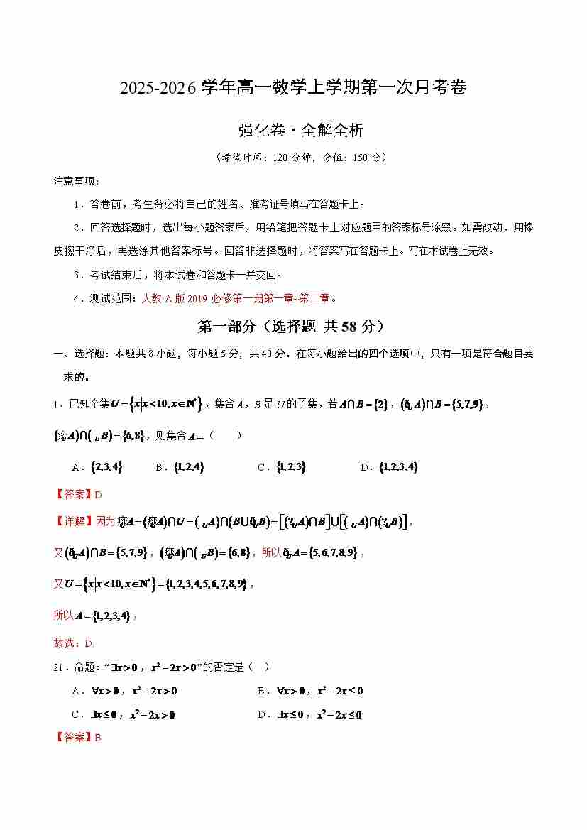 首页 > 全部 > 月考试卷 > 高一数学上学期第一次月考( 高效培优·强化卷)(全解全析)