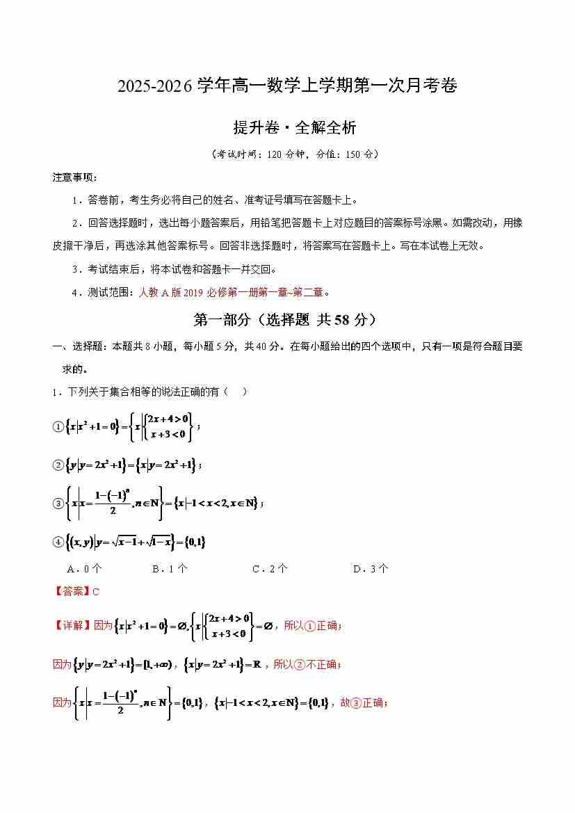 高一数学上学期第一次月考( 高效培优·提升卷)(全解全析)