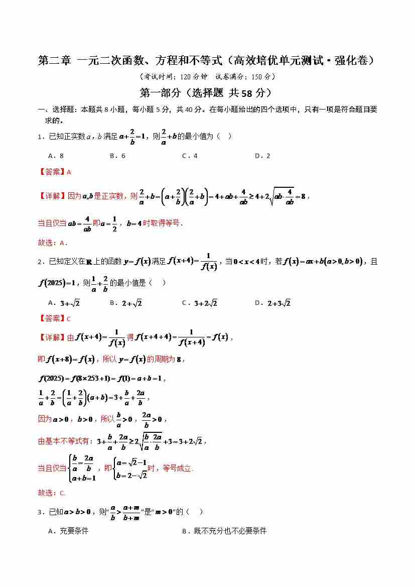 第二章 一元二次函数、方程和不等式(高效培优单元测试·强化卷)(教师版)