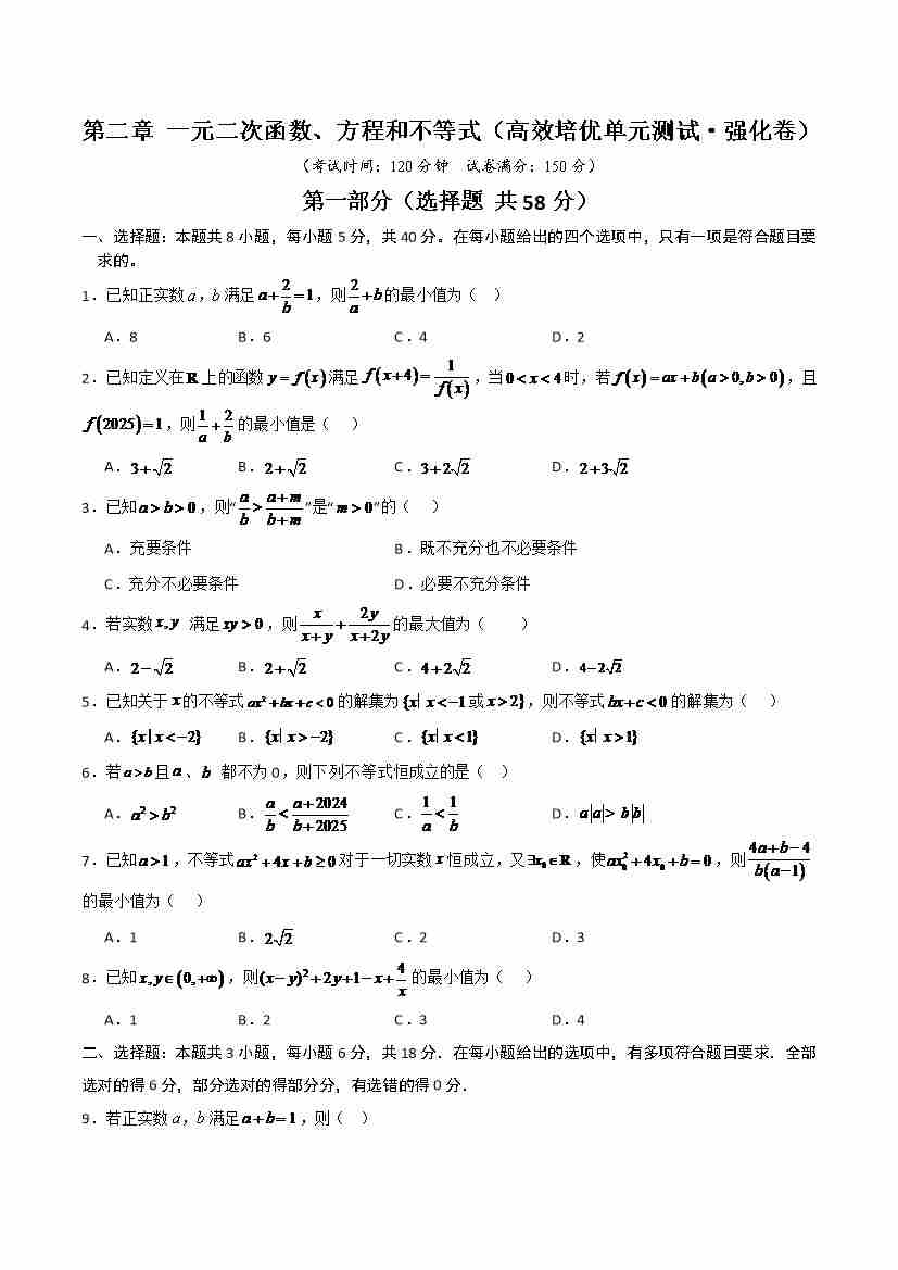 第二章 一元二次函数、方程和不等式(高效培优单元测试·强化卷)(学生版)