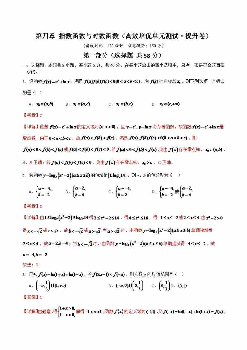首页 > 全部 > 单元测试 > 第四章 指数函数与对数函数(高效培优单元测试·提升卷)(教师版)