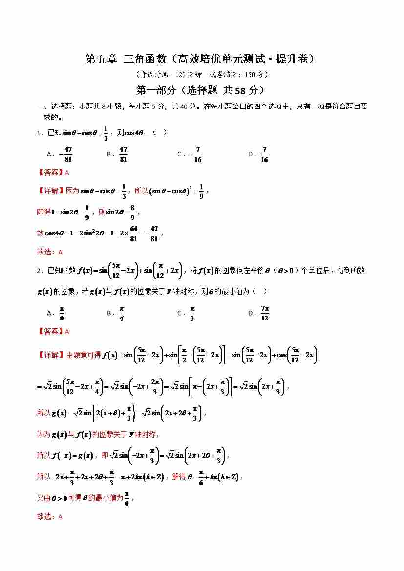 首页 > 全部 > 单元测试 > 第五章 三角函数(高效培优单元测试·提升卷)(教师版)