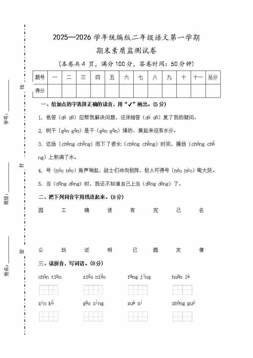 首页 > 全部 > 期末试卷 > 期末素质监测试卷及参考答案 统编版 2025—2026学年二年级语文第一学期