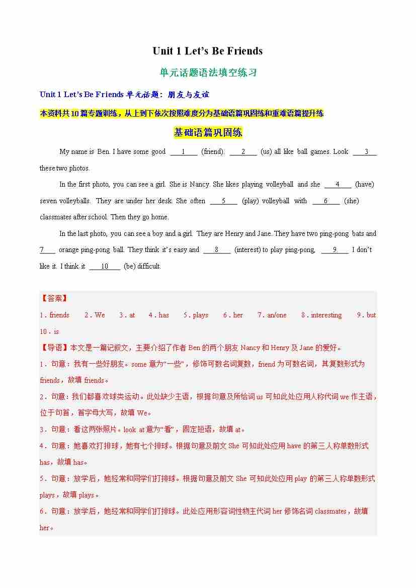首页 > 全部 > 重难点易错 > Unit 1 Let’s Be Friends 单元话题语法填空练习(教师版)