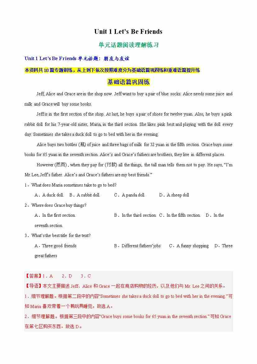 首页 > 全部 > 重难点易错 > Unit 1 Let’s Be Friends 单元话题阅读理解练习(教师版)