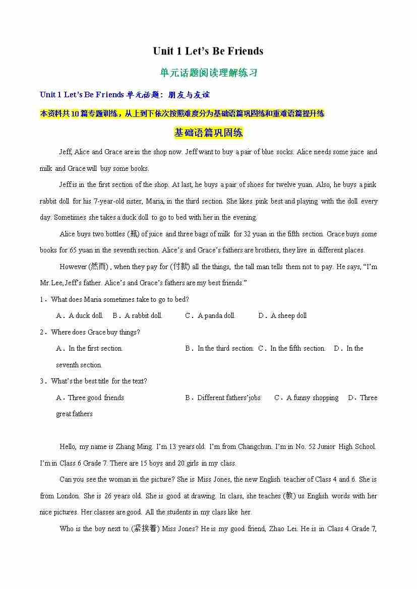 Unit 1 Let’s Be Friends 单元话题阅读理解练习(学生版)