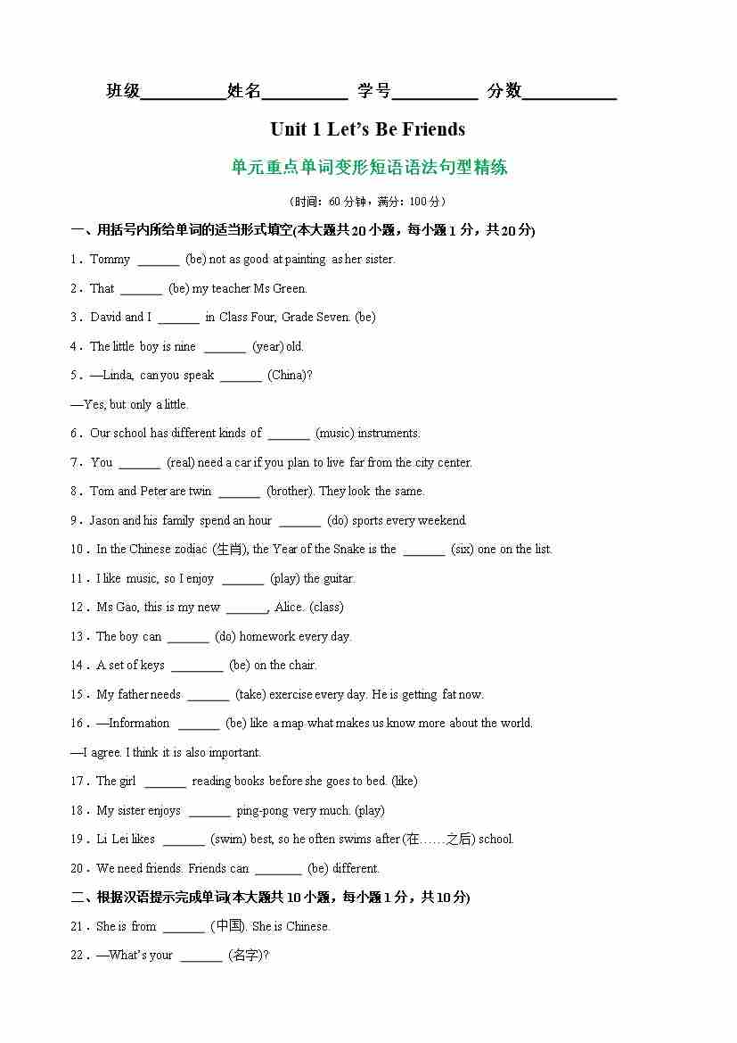 首页 > 全部 > 重难点易错 > Unit 1 Let’s Be Friends 核心单词,词性转换,短语,语法,句型精练(学生版)