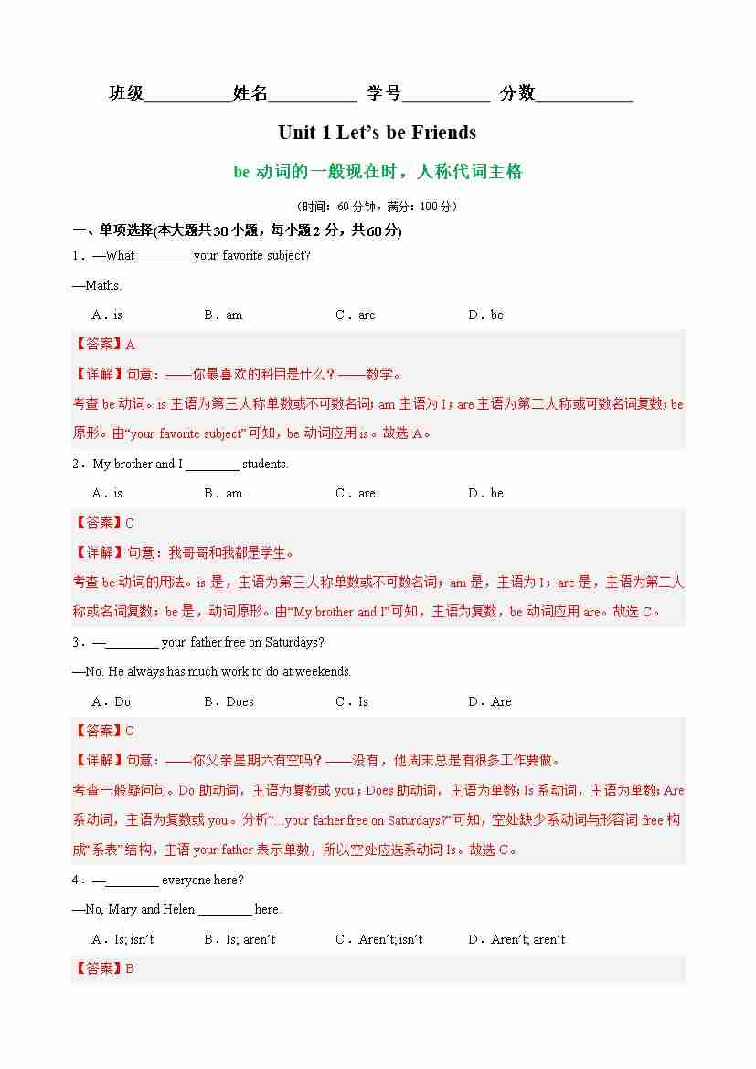 Unit 1 Let’s be Friends语法Grammar be动词的一般现在时,人称代词主格(教师版)