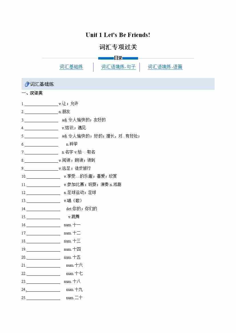首页 > 全部 > 重难点精练 > Unit 1 Let's Be Friends!(重难词汇精练)(学生版)