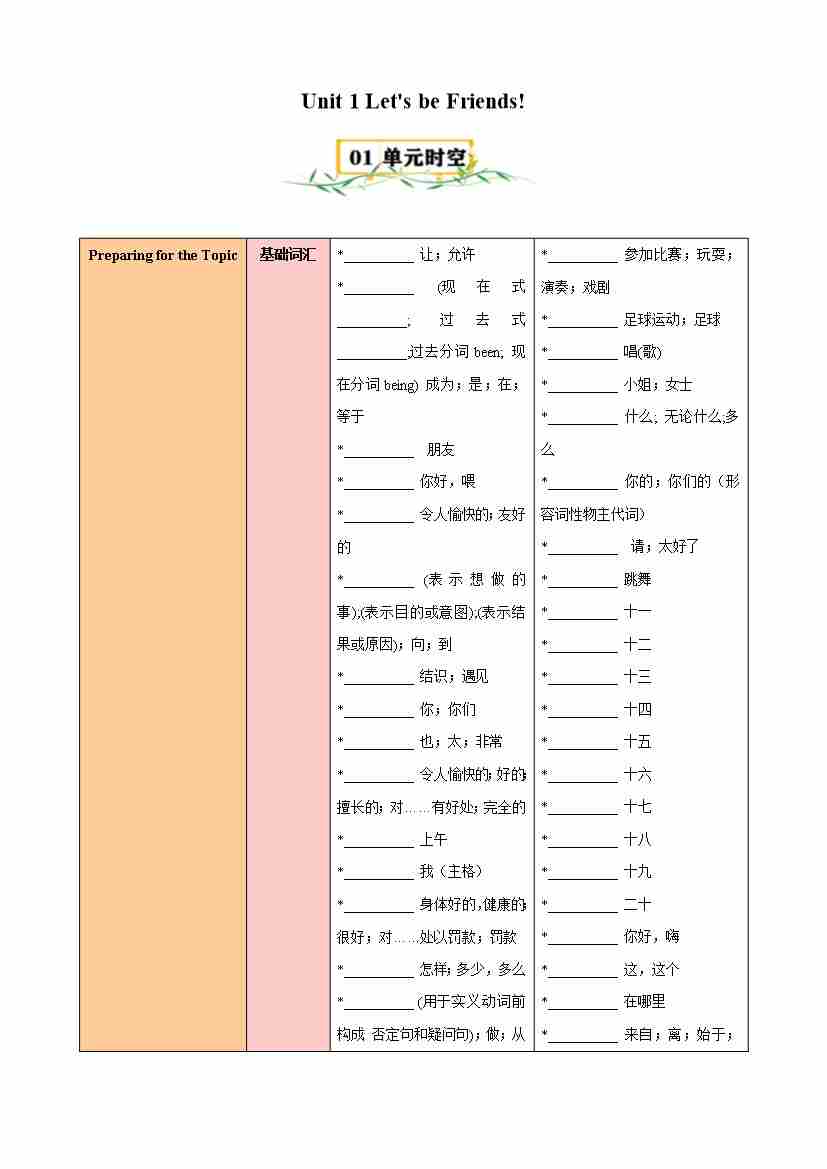 首页 > 全部 > 知识清单 > Unit 1 Let's be Friends!(知识清单)(挖空版)