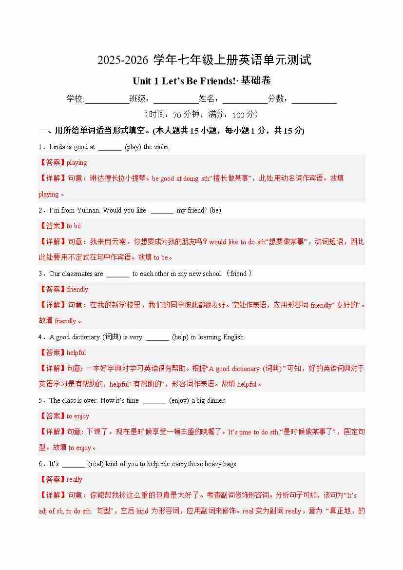 七年级英语上册Unit 1 单元测试·基础卷(教师版)