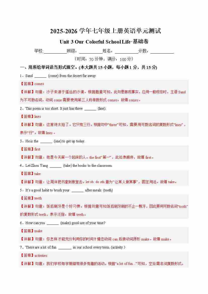 七年级英语上册Unit 3 单元测试·基础卷(全解全析)