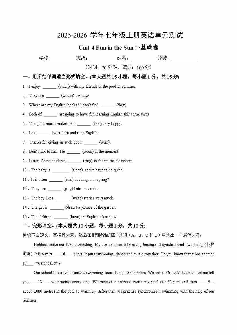 七年级英语上册Unit 4 单元测试·基础卷(考试版A4)