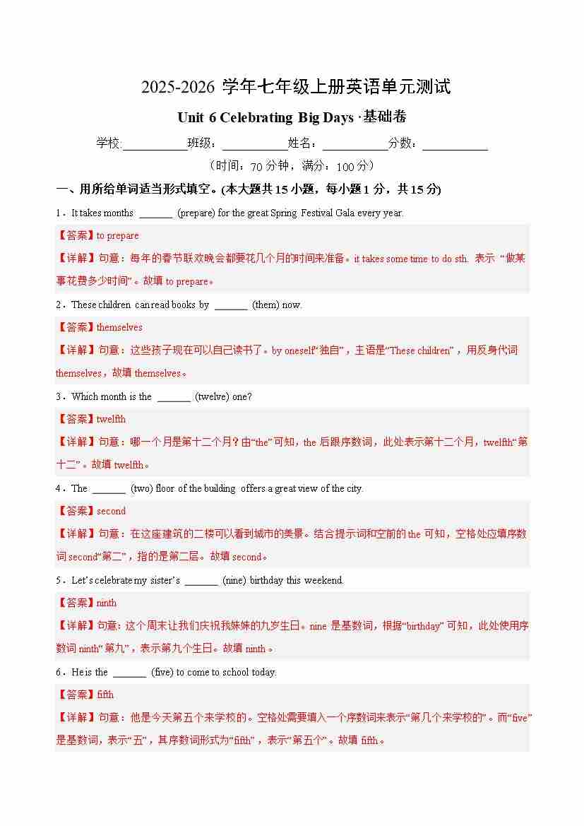 七年级英语上册Unit 6 单元测试·基础卷(教师版)