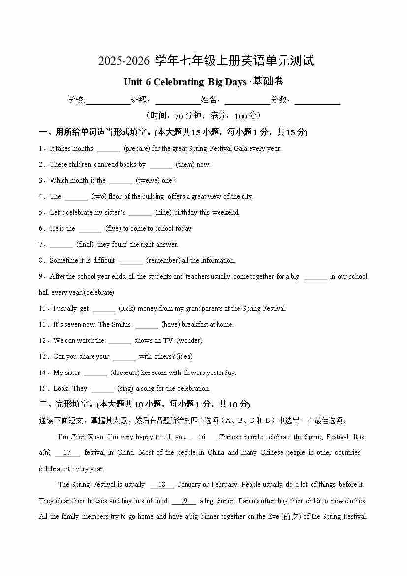 首页 > 全部 > 单元地区卷 > 七年级英语上册Unit 6 单元测试·基础卷(考试版A4)