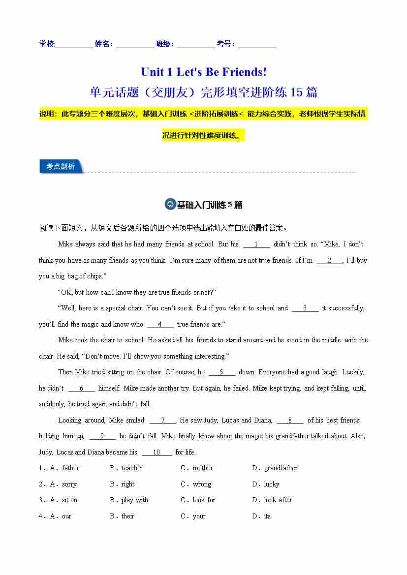 首页 > 全部 > 期中专项 > Unit 1 Let's Be Friends! 单元话题(交朋友)完形填空进阶练15篇(原卷版)