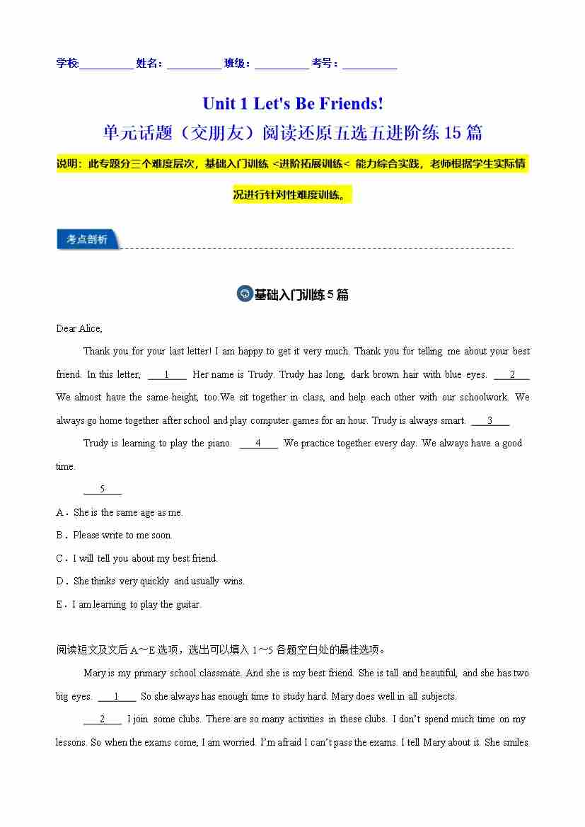首页 > 全部 > 期中专项 > Unit 1 Let's Be Friends! 单元话题(交朋友)阅读还原五选五进阶练15篇(原卷版)