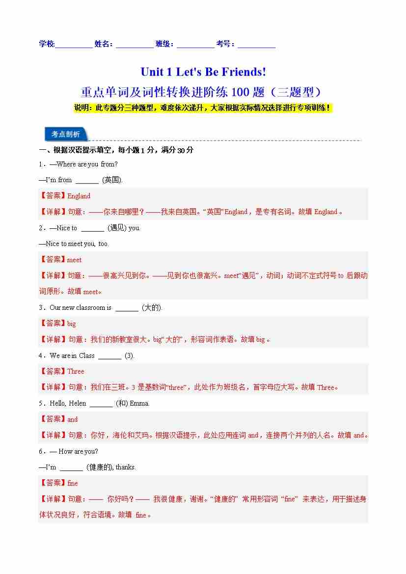 首页 > 全部 > 期中专项 > Unit 1 Let's Be Friends! 重点单词及词性转换进阶练100题(三题型)(解析版)