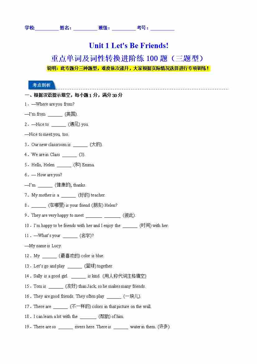 首页 > 全部 > 期中专项 > Unit 1 Let's Be Friends! 重点单词及词性转换进阶练100题(三题型)(原卷版)