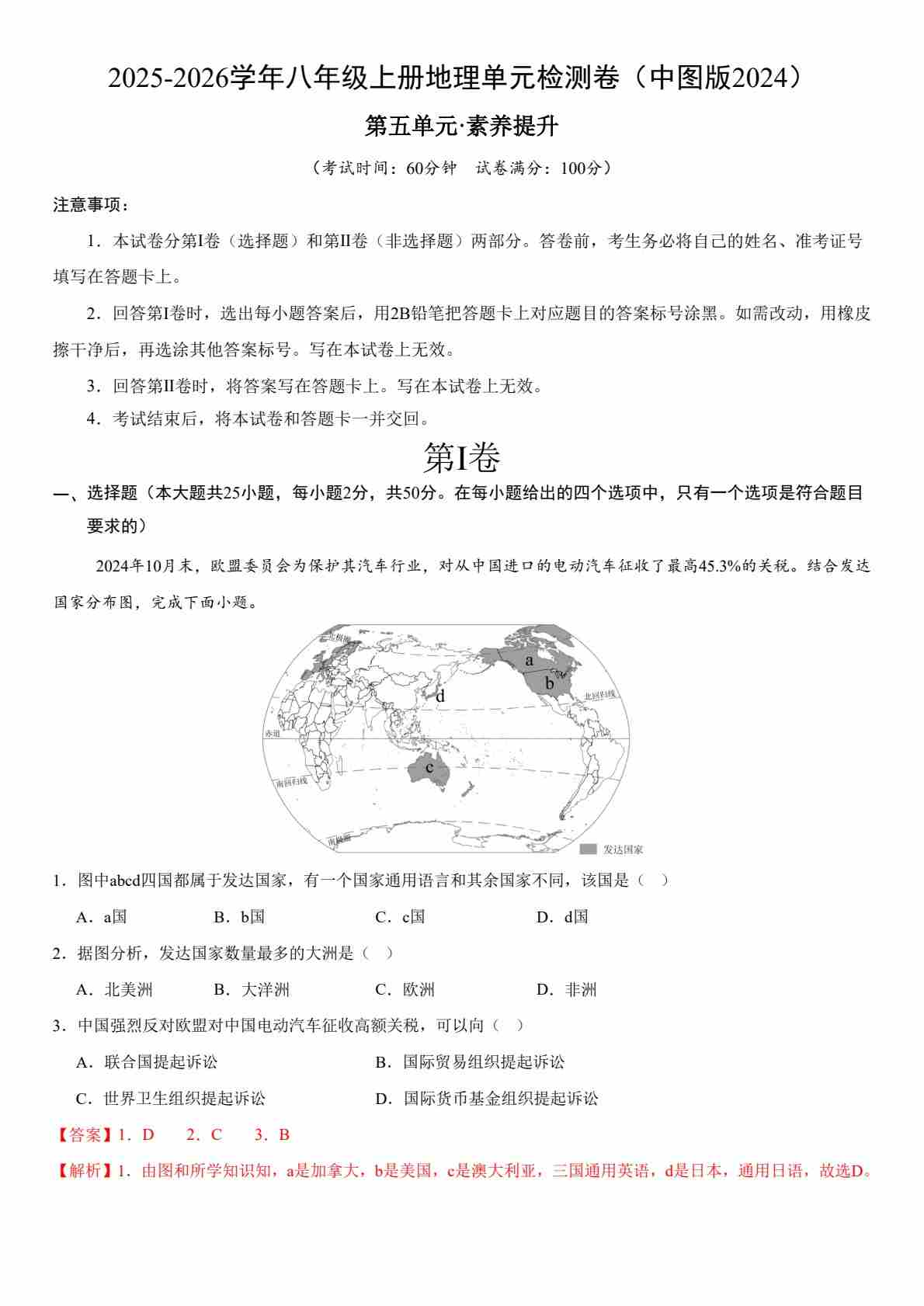 首页 > 全部 > 单元测试 > 第5章 发展与合作(单元测试·提升卷)地理中图版2024八年级上册(解析版)