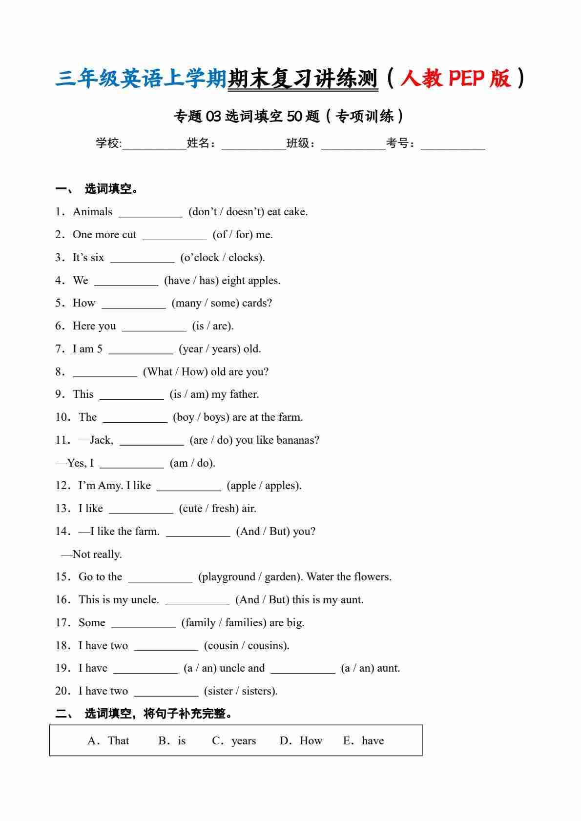 专题03选词填空50题(专项训练)-三年级英语上学期期末复习讲练测(人教PEP版·)