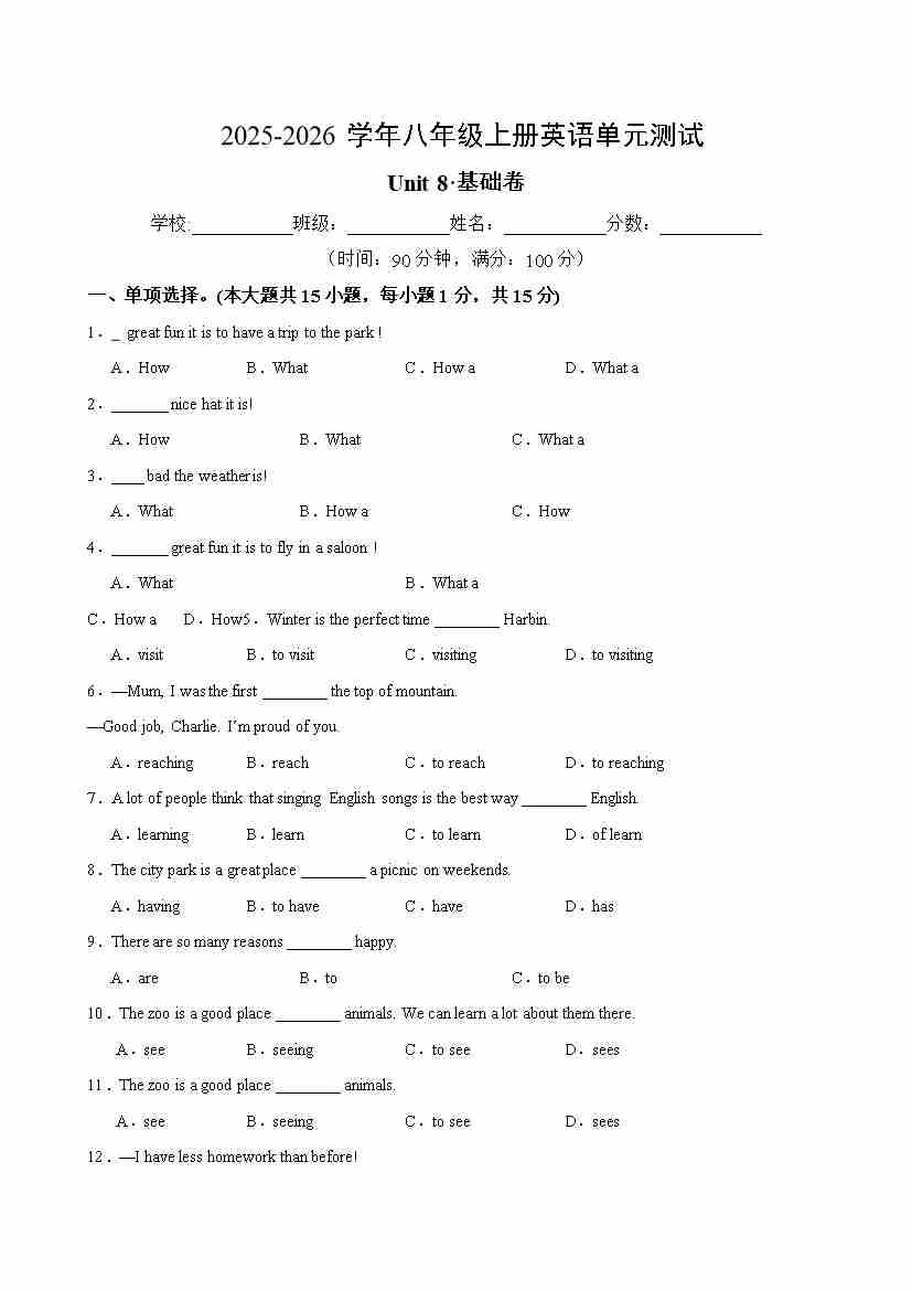 首页 > 全部 > 单元基础卷 > 八年级英语上册Unit 8单元测试·基础卷(考试版A4)