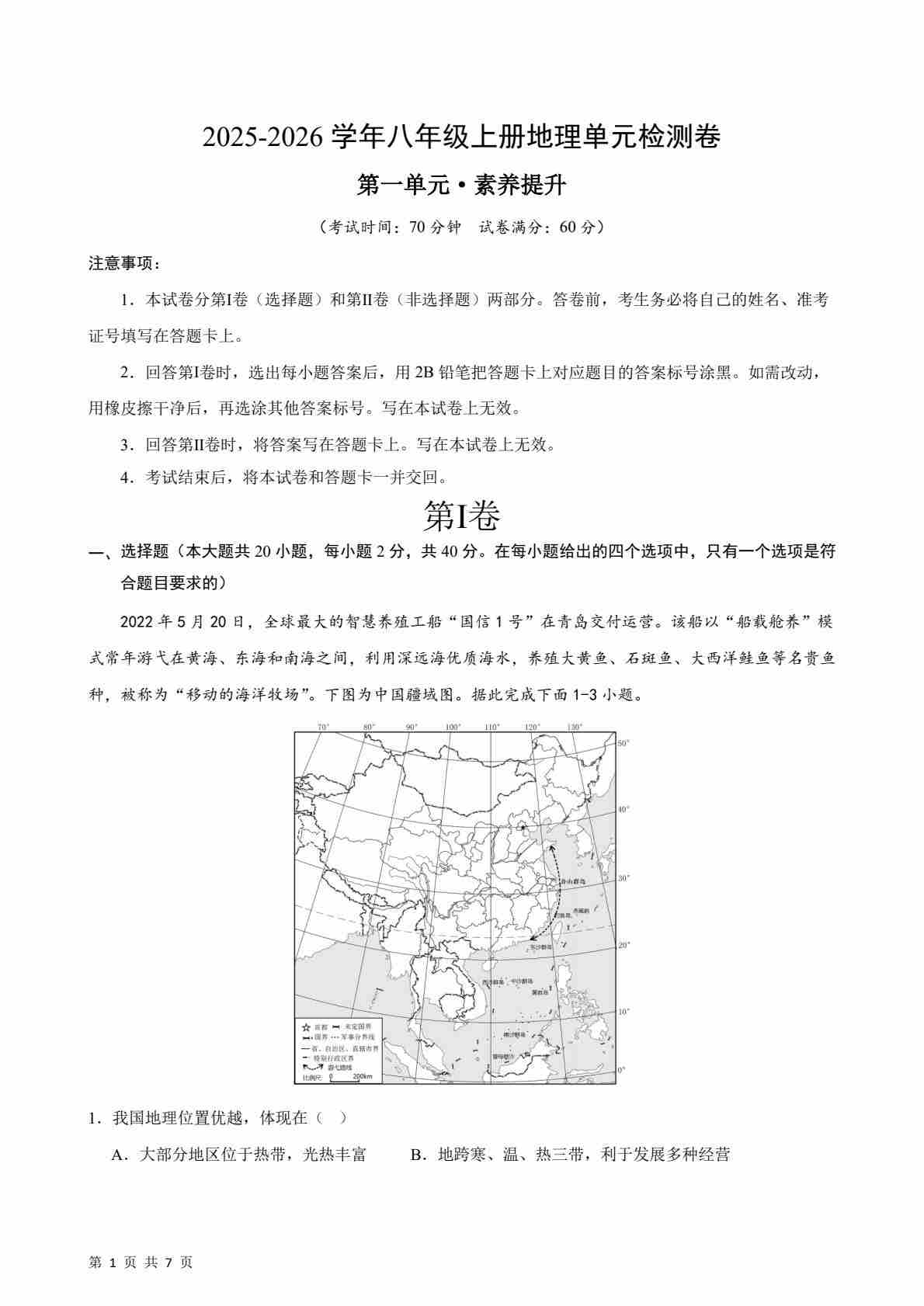 第1章认识中国的疆域和人口 测试·提升卷(考试版A4)