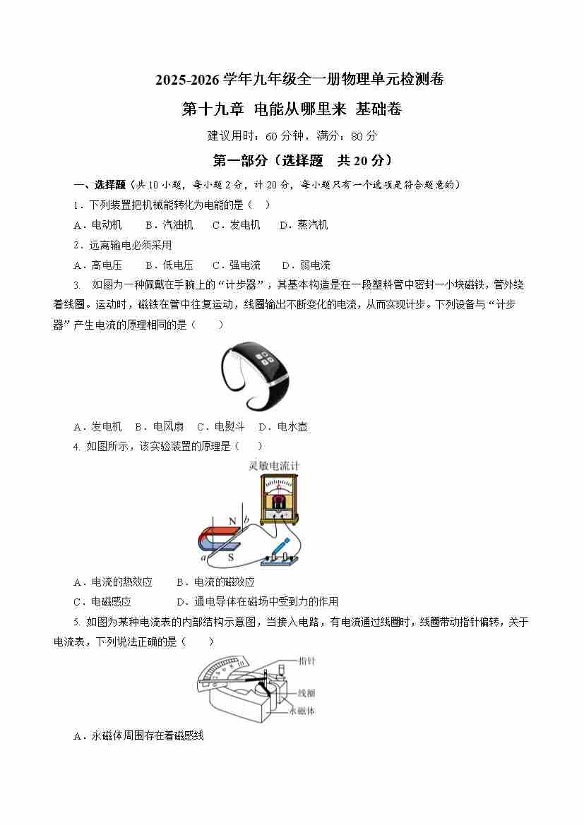 首页 > 全部 > 单元测试卷 > 九全一册 第十九章 电能从哪里来 单元测试·基础卷(考试版A4)